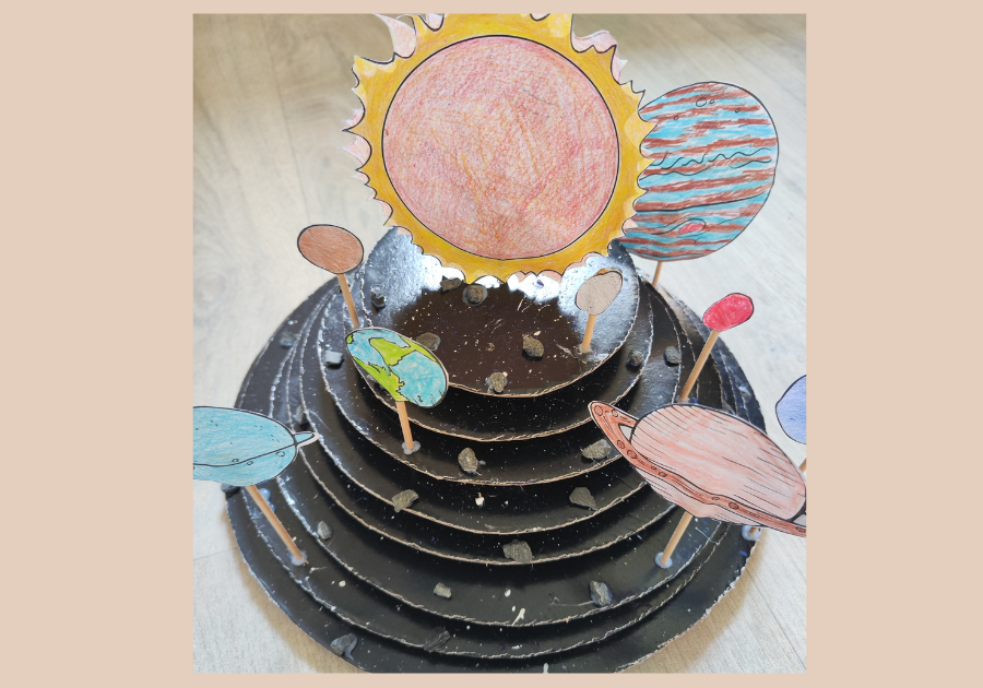 Vyrobte si (nejlépe z černého) kartonu 8 kruhů, největší s průměrem cca 35 cm, nejmenší cca 14 cm. Pocákejte barvami, na okraje nalepte kameny coby meteority. Pak si vyrobte planety a slunce dle přiloženého pdf.souboru. Inspiraci jak planety vybarvit jsme našli v knížce o vesmíru. Planety přilepte tavnou pistolí každou na svůj samostatný černý kruh a navlečte od nejmenšího kruhu po největší na špejli se sluncem. Každý kruh zespodu podložte malým kouskem kartonu, aby jednotlivé kruhy byly od sebe odděleny a mohly se samostatně otáčet.