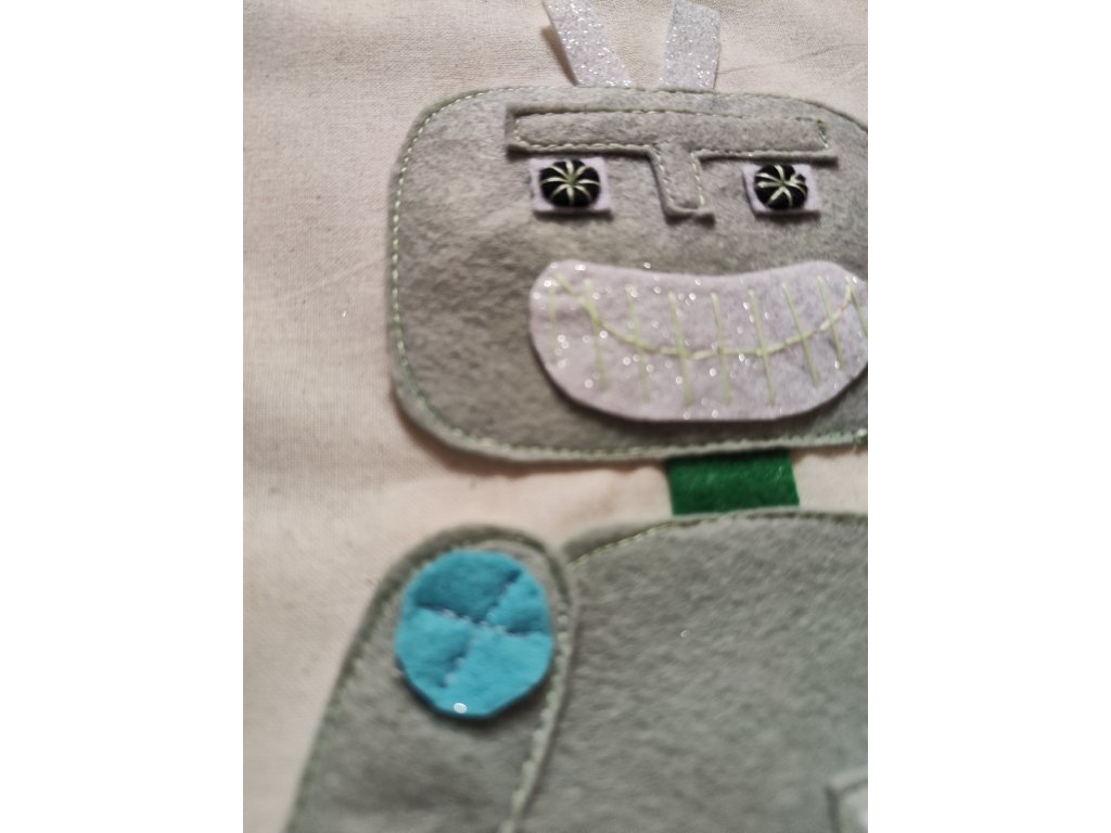 Robot má třpytivé detaily, které připomínají kovové díly,